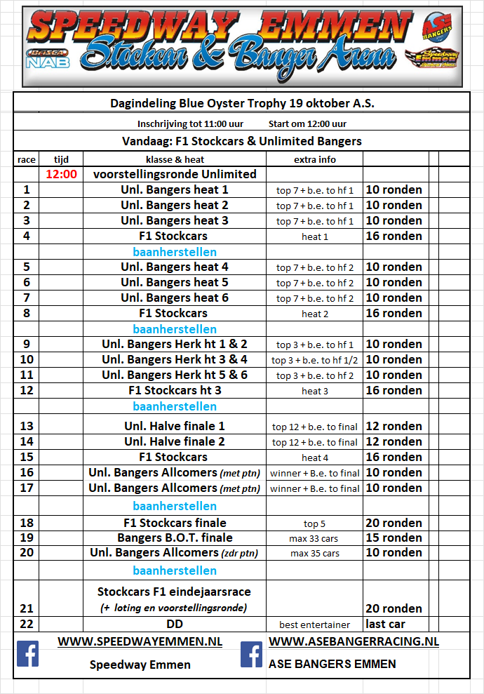 We beginnen om 12:00 uur met voorstellingsronde voor de Bangers. Als het goed is We verwachten rond 20:00 uur klaar te zijn. De dag zal afgesloten worden met vuurwerk! Uiteraard zijn er ook snackwagens aanwezig voor warme hap en koude dranken. Glaswerk is op en rondom de baan verboden! Blik of plastic is geen probleem.