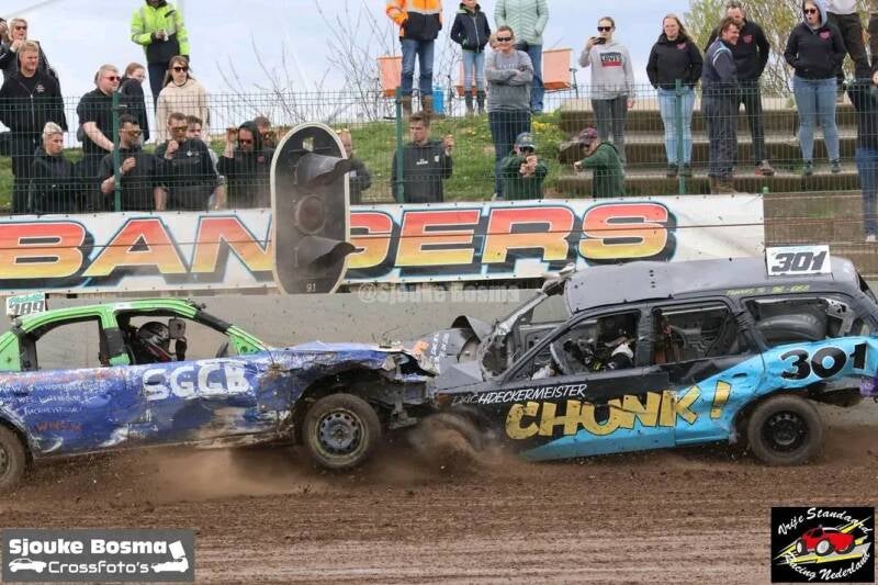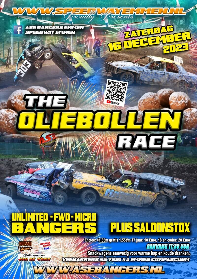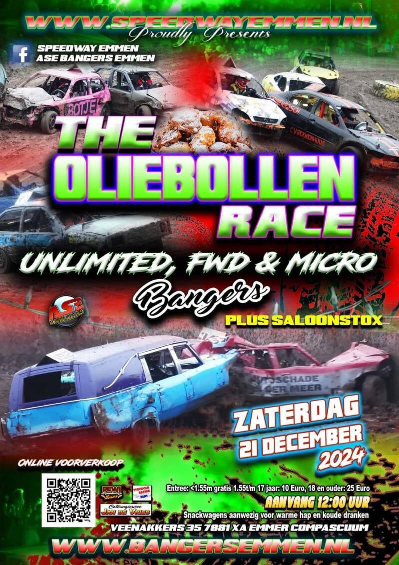 De oliebollenrace is een echte ‘Banger’ dag, waarbij diverse contactklasses aan bod komen. Zo waren er Unlimiteds, Fwd en Micro Bangers en een volle heat met SaloonStox.